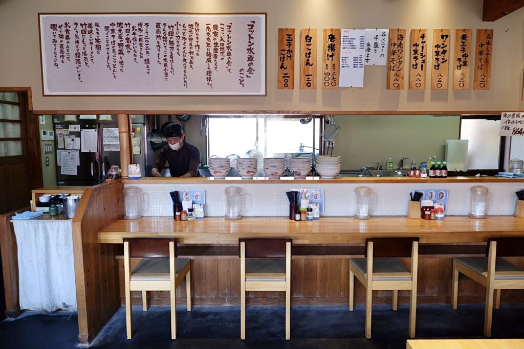 九州では珍しい醤油味のラーメン「竹田の中華そば」屋です。日本名水百選の河宇田湧水の水汲み場横にあり、もちろんこの湧水を使って麺とスープは作られています。一風堂ラーメンのプロデュースで生まれたもちもちの麺、すっきりとしながらも旨みぎっしりで、最後まで飲み干したくなるスープは癖になる味です。野菜や食材も、大分県産や地元産のものを使って、丁寧に手間暇かけて作られています。人気のお店で、特に休日には店の外で待つ人が大勢いらっしゃるため、時間に余裕を持って行かれてください。