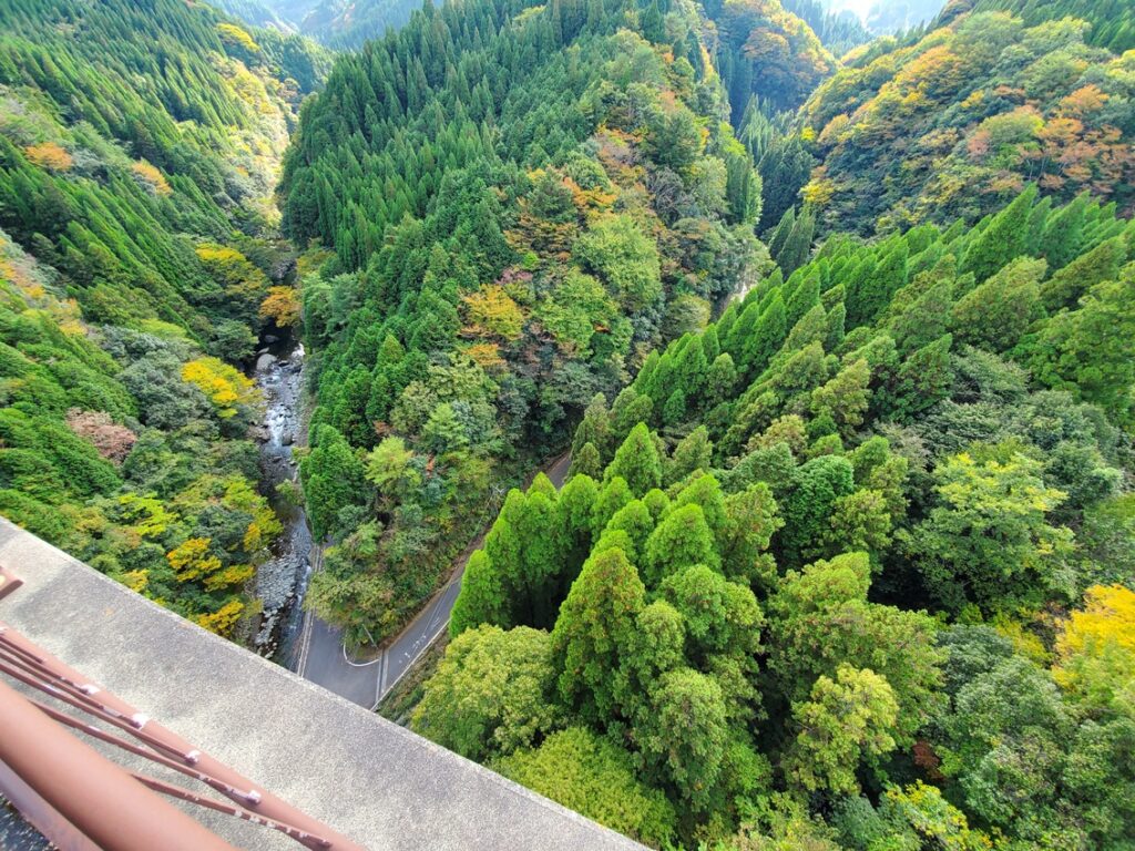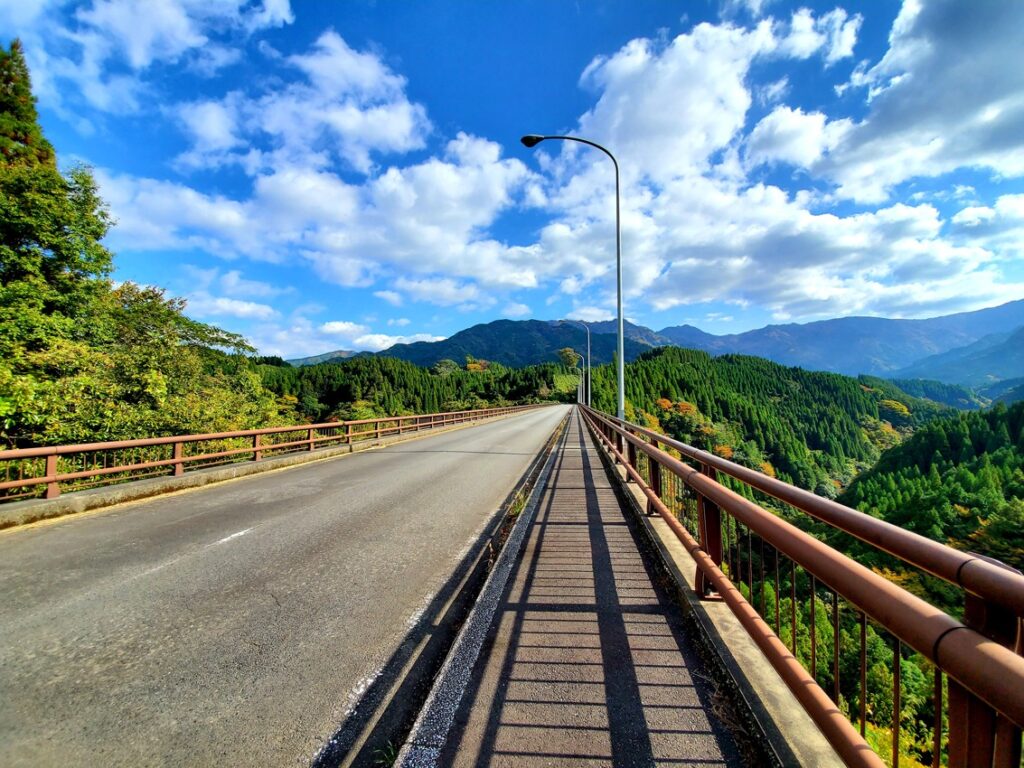 神原渓谷の上にかかり、ロアリング工法(足場を組むことが困難な峡谷などで使われる安全で省力化が測れる施工法)で作られた橋としては日本最大級の橋、支間の長さは世界第2位と言われています。 橋の中央には踊り場があり、その高さに足がすくむかもしれませんが、祖母山と周辺の山々や樹々、神原渓谷の絶景を見ることができます。特に 紅葉の時期がオススメですが、新緑の頃などいつ行っても美しい眺めが楽しめます。